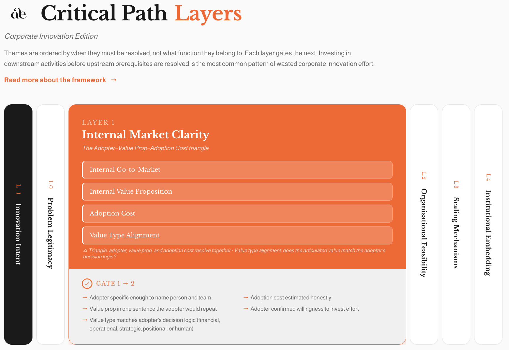 Every article here treats a specific structural pattern in depth — a failure mode, a misread signal, a dependency that organisations skip and pay for later. Some map directly to a CPL layer: an article on POC failure is a Layer 2 treatment; an article on scaling crises is a Layer 4 diagnostic. Others cut across layers, examining dynamics like the Founder Bottleneck or the Heroics Trap that surface differently depending on where in the dependency structure a startup or corporate innovation team is working. Where an article speaks to one track more than the other — startup or corporate — I've noted it, but most of the structural patterns apply to both. The forces are the same; the organisational terrain differs.